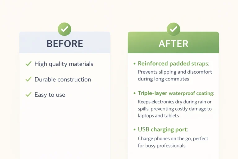 Example: âTriple-layer waterproof coating keeps electronics dry during rain or spills, preventing costly damage to laptops and tablets worth hundreds of dollarsâ